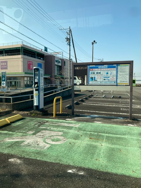 店舗から離れた場所にあるので分かりにくかったです。 ここの駐車場はいつも混んでるから店に近いと普通の車がとめてしまって充電できなくなるからここしかないのかな?