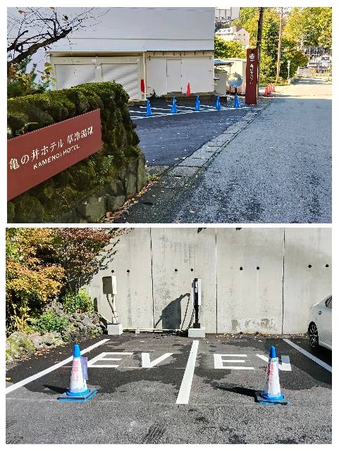 使用レポート!しゃくなげ通りからホテルへ入ると、駐車場左側手前に2台分のEVスペースがパイロンで確保されています。