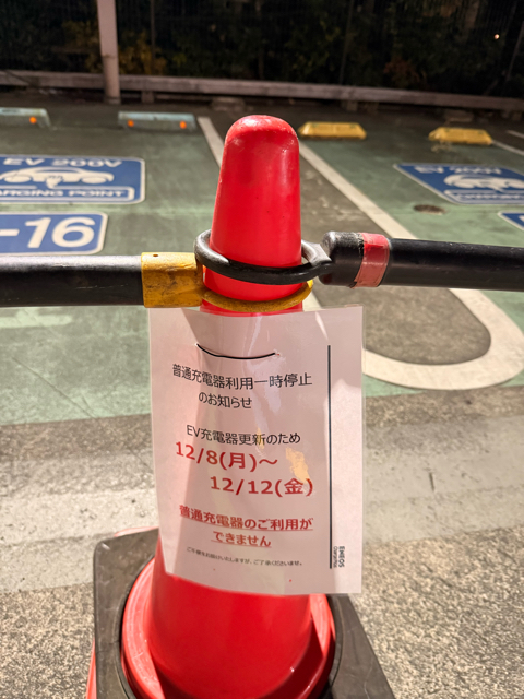 現在、店舗増床工事のため使用可能な普通充電器は4台ですが、今日(10/11)から3日間の昼間は大型クレーン作業のため2台のみ使用可になります。急速充電器は通常通り2台使用可です。