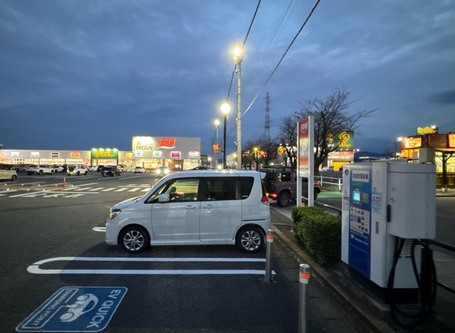 コインランドリーとたこ焼きの客の車が邪魔している。どちらかの隣の駐車枠が空いていれば何とかなるが、少しぐらいは待つ覚悟が必要。世間的にはまだまだ、EV充電へ認識が低すぎる。区画全体をブルーカラーでペイントでもしないと充電用の区画であることが分からないと思う。