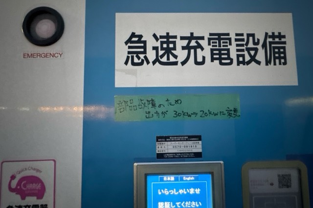 養生テープに手書きで「部品故障のため出力が30kW→20kWに変更」と充電本体に表示あり。オフシャルな案内かは不明です。