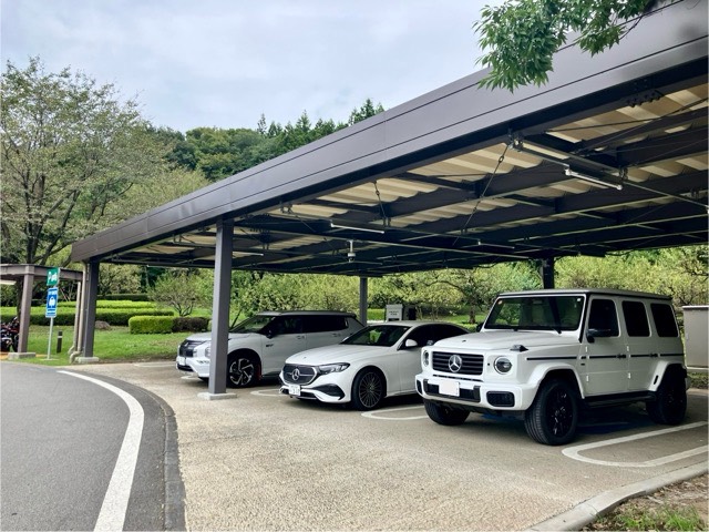 テスラ充電出来ました。 最前列の駐車場を出口方面に向かっていくと屋根付きであります。