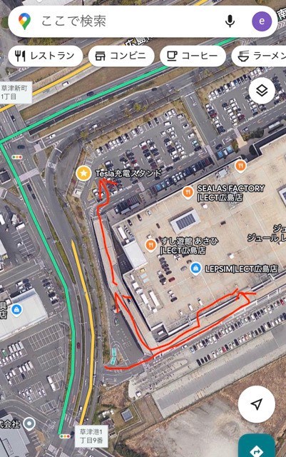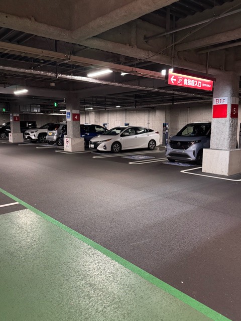 赤矢印の入口から入り、すぐに地下駐車場へ 地下駐車場は何となく赤線のように進み、 オレンジ色の看板 「2号線出口」に向かう。 (地下には五日市出口とあるが それは言ったらダメ🙅♂️) 2号線出口を出たら再び地上へ出れます。 そうすれば SCにたどり着ける。 地下には 他にもEV充電器もありました。