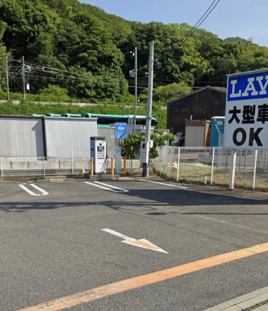 駐車場の1番端(写真の赤丸)に設置してあります。 よく手前の駐車枠に長時間停車のトラックが停まっており、 広島市内側から来るとトラックの影になって充電器が見えないことが多いです。