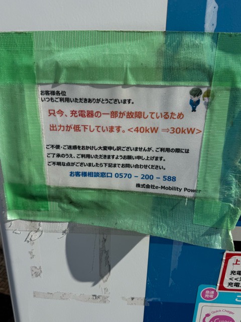 いまだに30kWで運用されております。 充電器の一部故障で出力低下と貼り紙があります。 ここは2025年度内に新しい2口機が設置予定なので、修理は行わず切り替えられるのでしょう。