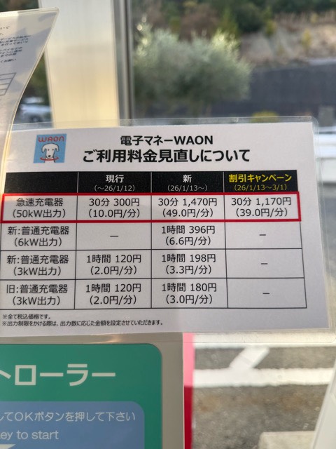 [急速充電器] 2018/04/24よりNCS(現eMP)スポットとして運用。 [普通充電器] 2018/04/24よりNCS(現eMP)スポットとして運用。 【ビジター料金やeMP未加盟充電器の情報等】 ◆WAON認証の場合 [急速充電器] WAON(充電1回30分300円(税込))。 [普通充電器] 2020/02/27より充電有料。 WAON(充電1時間120円、2時間240円、3時間360円(税込))。 eMP提携充電カードで支払いの場合はご利用の料金プランに準じた金額になります。