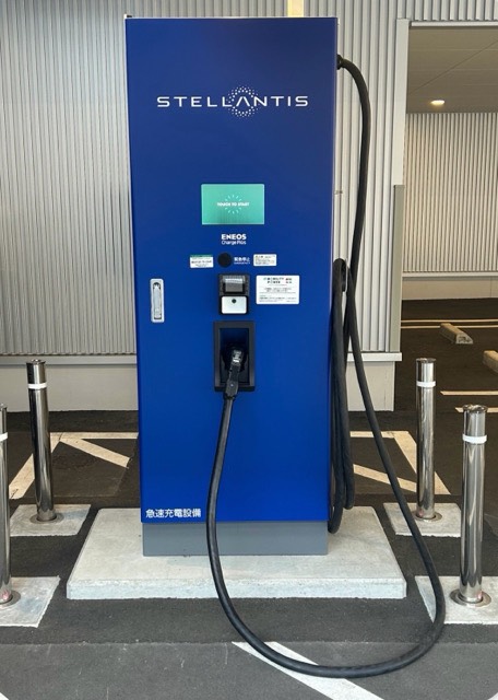 店舗ショールームの裏側の駐車場に設置されています。 ラッピングされていますが、エネオスの充電器でした。