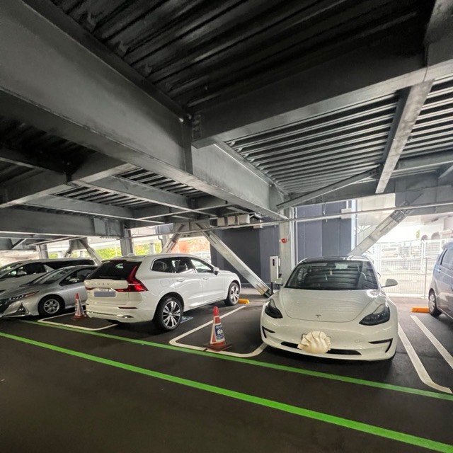 駐車場は広く充電器の場所は奥なのですが、 比較的クラブハウスに近いのでとめやすい場所だと思います。 ガソリン車が集まりやすいです。