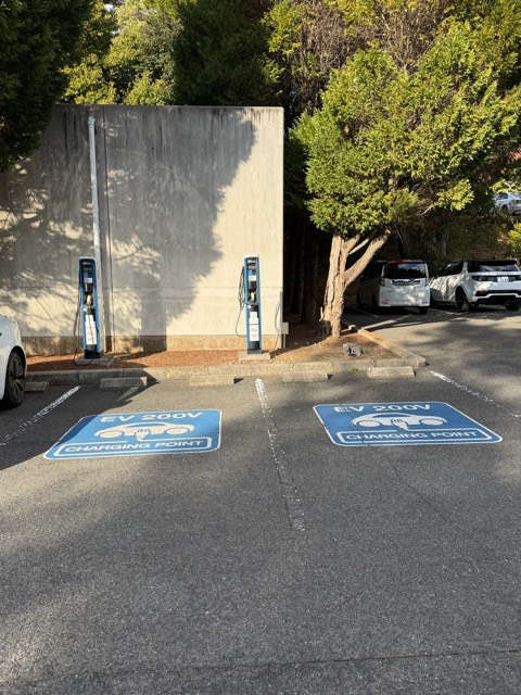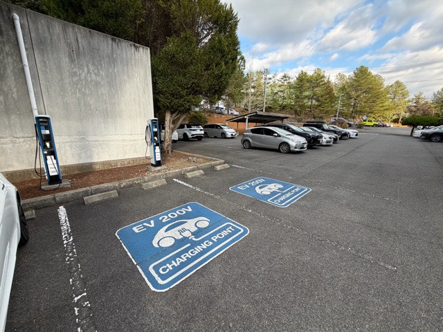 クラブハウスから離れた南西側の駐車場に普通充電器3kWが2口あります。 入り口にEV 200Vの看板もあります。
