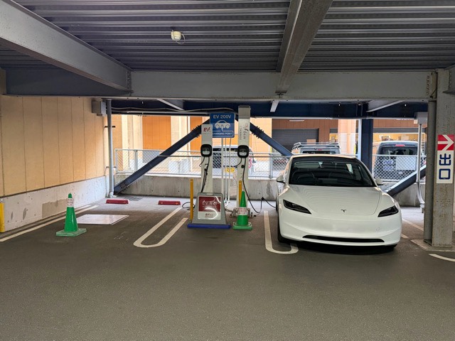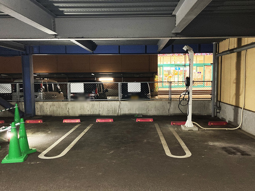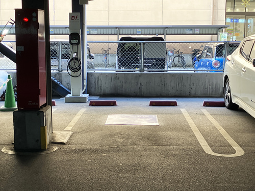 設置場所:立体駐車場1階にEV充電器があります。 どなたでもご利用いただけます。 最大出力6kW 施設の電気容量により一時的に充電器の出力が変動する場合があります。