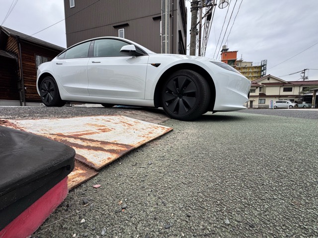 縦置きの駐車枠に変わっておりました。 モデル3 18インチでノーマルサスでは、底を擦ることはなかったですが、あまりマージンはなさそうです。 車高を落としている方は要注意です。