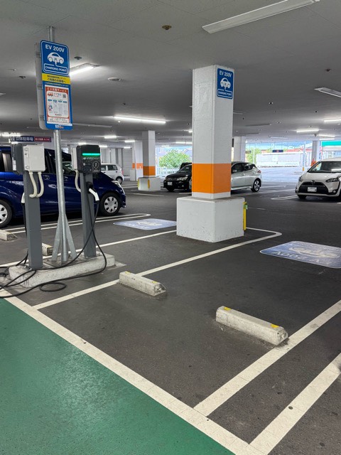 ゆめタウンが見える タイムズカーシェアさんのレンタカーが置いてある一角に充電器があります。 やはり、ここも充電速度が遅いです。 e-mobility powerさん そこをなんとか、宜しくお願いします。