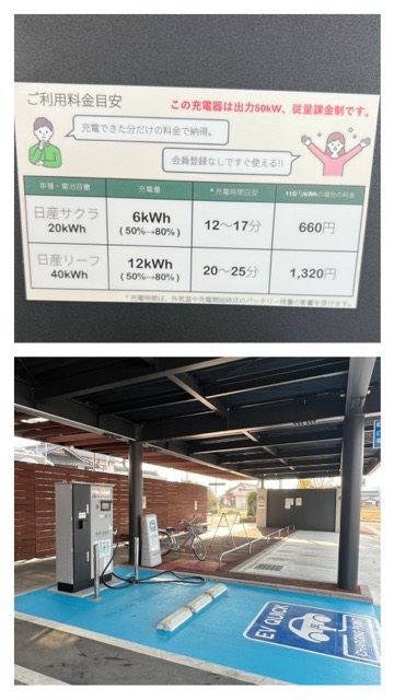 新しい充電器が設置されてました。 50kW級の急速充電器で、カード決済。 従量課金制で、1kWhあたり110円でした。