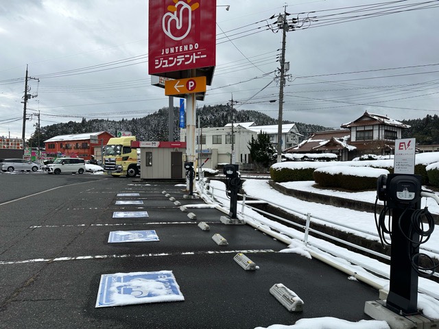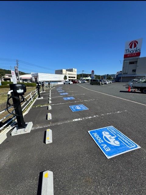 平面駐車場の北西側に6kWの普通充電器が8台あります。 店舗の出入り口から離れている事と、駐車枠にEV 200Vの記載があるので、ガソリン車はとめにくいとおもいます。