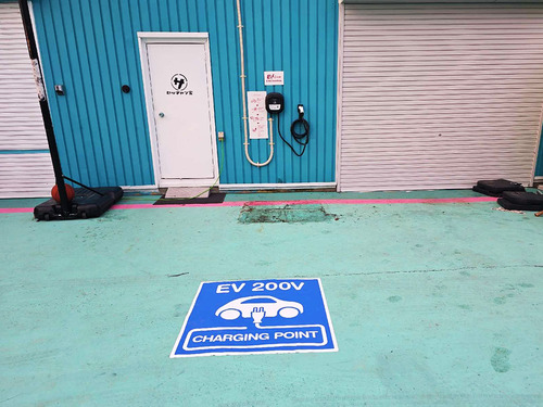 設置場所:建物正面の車室にEV充電器があります。