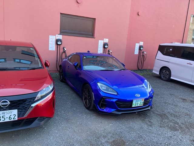 宿泊者の車で満タン、たまたま、一台出て行ったので、なんとか、充電できました。 EV優先のカラーコーンをどけて、レンタカーが駐車していた。