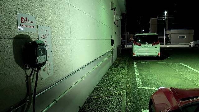 祝祭日24時間設置場所:道道291号線沿いの駐車場入り口から入り、施設外壁沿いの縦列車室にEV充電器があります。 どなたでもご利用いただけます。 最大出力6kW