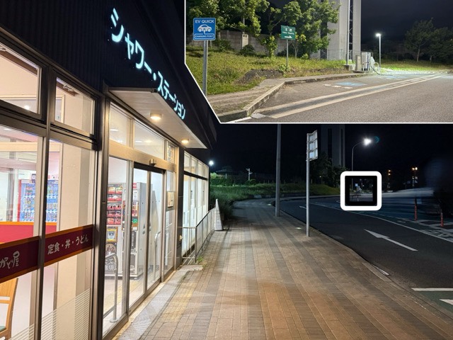 道路から見て右側(西)の道路に入って進むと道路に面した駐車場にあります。文書と 写真追加 90kWの1口タイプは、充電待ちの可能性は増えますが、分け与えて充電量が減ることはないので空いていればどんどん使っていきたいところですね。