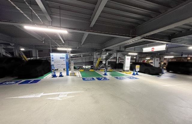 EV用充電設備は、立体駐車場2Fに設置されています。 2Fへ上るスロープを上って180度右Uターンするとすぐ右側に充電設備が有るので、後続車が有る時はスロープを上っている時からハザードランプを点灯させるなど後続車から追突されないように注意した方が良いと思います。