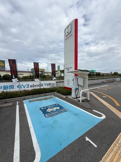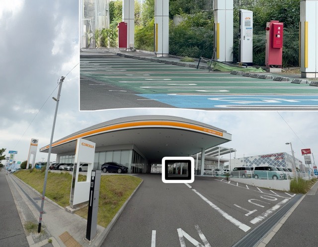 側道の道から見て右側、セブンイレブンの看板の近くにあります。 この辺りは急速は数あれど24時間営業は少なかったので増えたのは嬉しいですね。使用中でも至近距離に24時間のトヨタの急速もあります(写真でいうとレクサスの建物の左側から入るとあります。 追記: 45kW出ていました。 追記2: 「充電終えた後のケーブルは元の位置に戻してください」どの張り紙がありました。気をつけましょう。 文書改訂