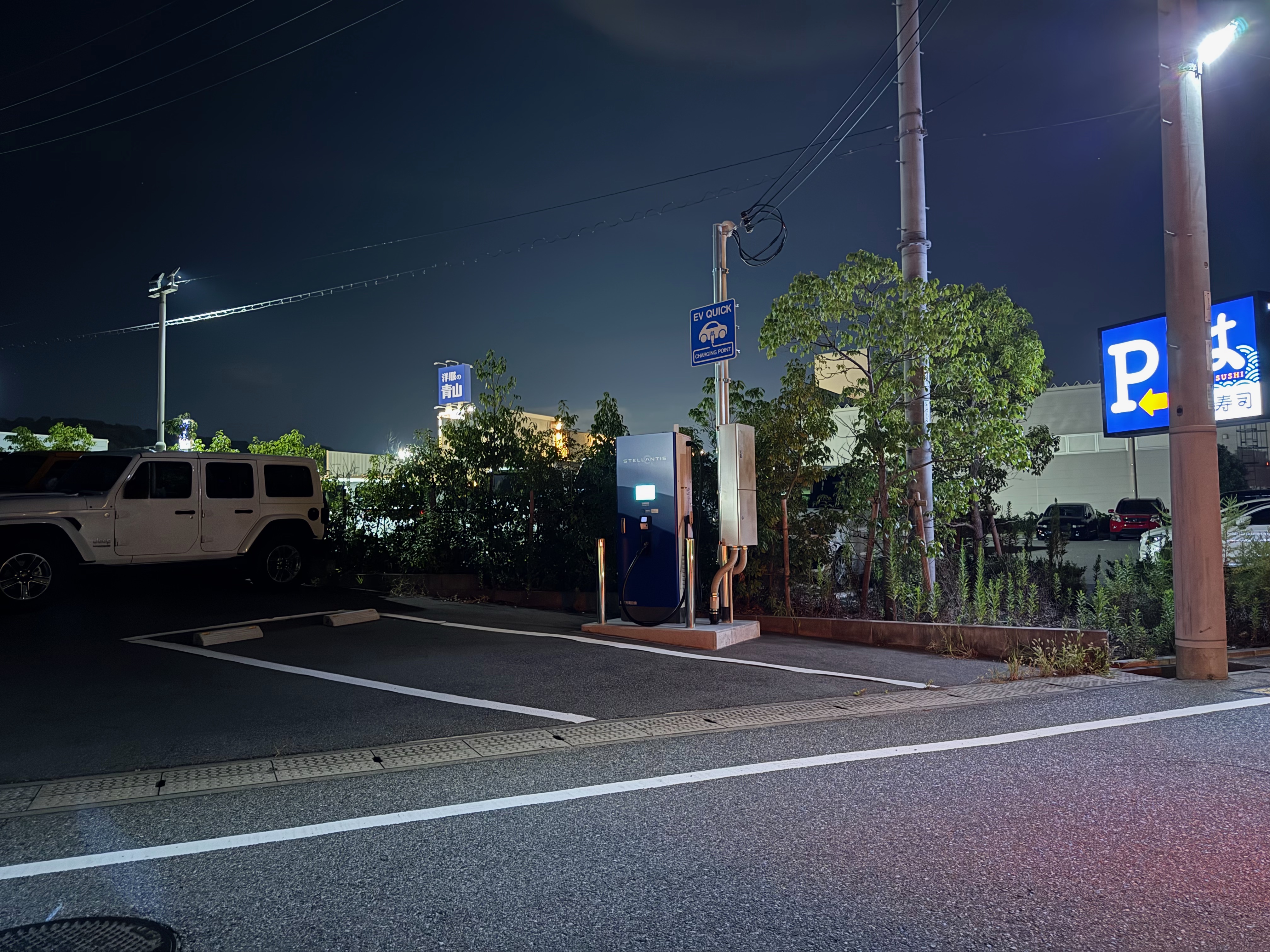 敷地に入って奥に進むとお店の裏側の道沿いにあります。 充電のみなら裏の道から行けそうですが、住宅が並んでいるのでゆっくりと安全走行が良いと思います。