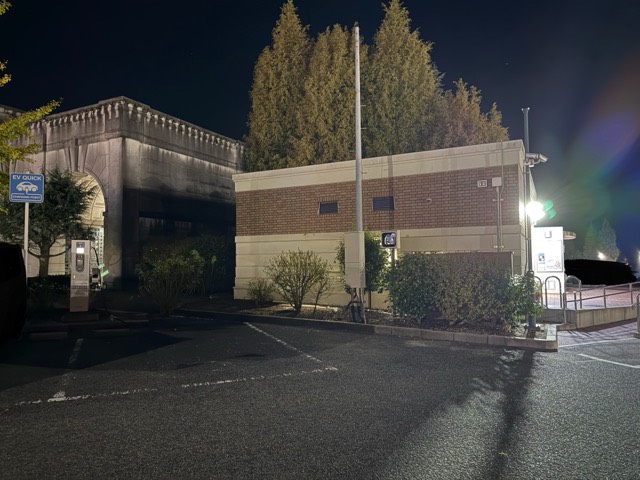 EV用普通充電設備は、R428(通称:有馬街道)から敷地に入り、前方の橋を渡ってすぐ右側に設置されています。 平日お昼頃に到着しましたが、「EV」マークのおかげか?充電に関係ないエンジン車の駐車は有りませんでした。