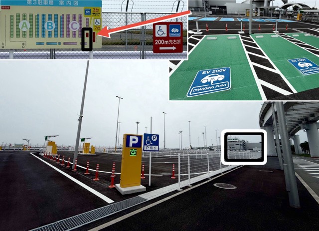 ターミナルビル手前の駐車エリアで第1、第2Pより手前で左へ入っていきます。 文書と写真追加 コンセントが3つですが空港には目的地充電だと、一歩前進したような感じで良いような感じがします。