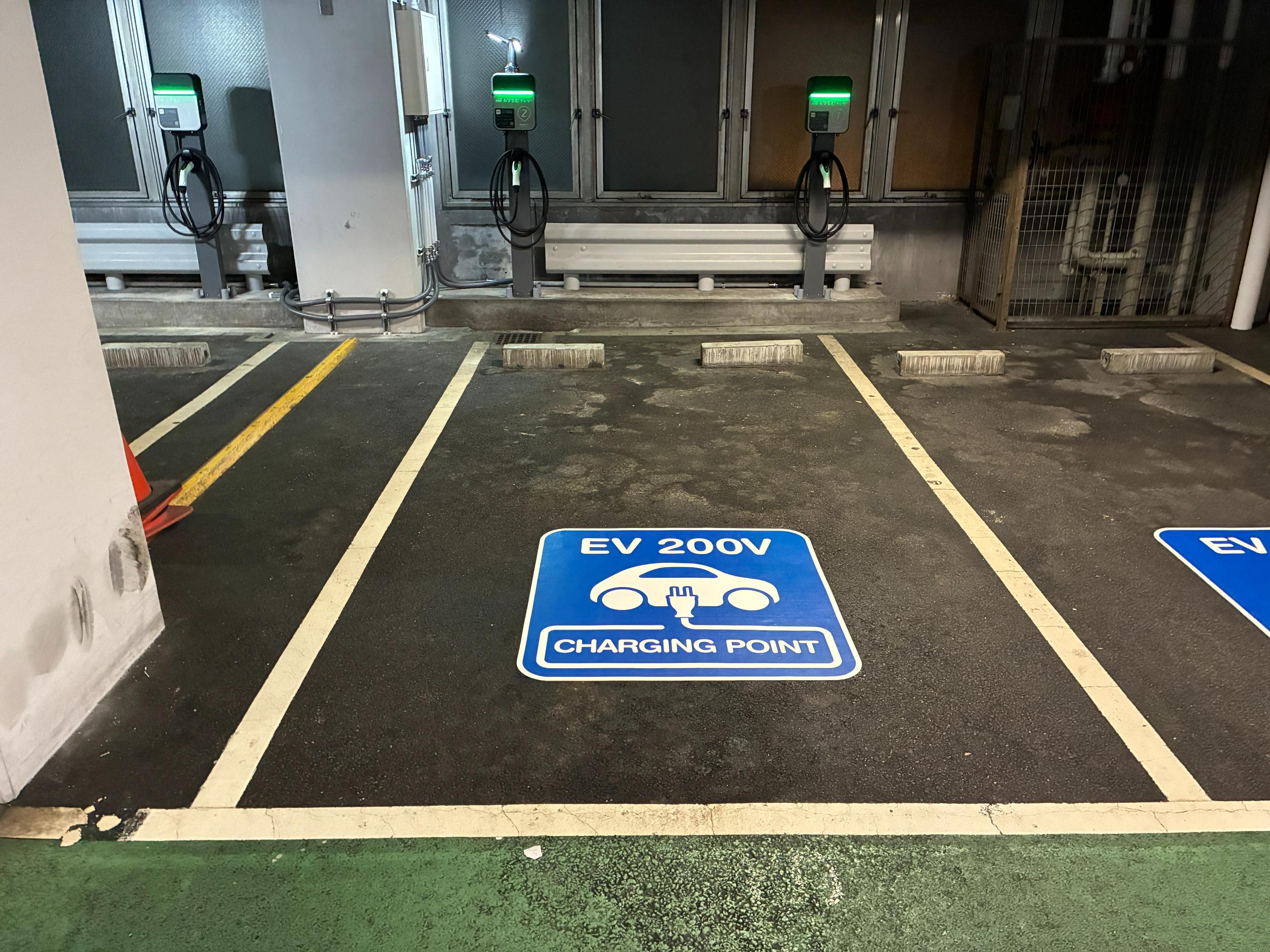 設置場所:地下2階 受付不要。 2口の充電器が1基設置されています。 充電時間制限なし。