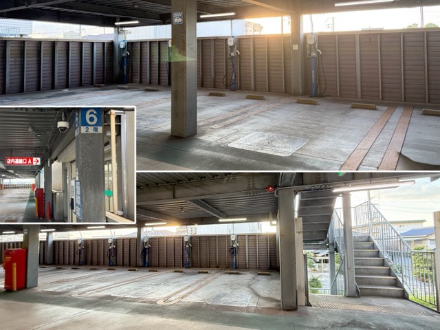 立体駐車場2階の西側の店舗入り口とは離れた方の中央寄りに並んでいます。 コントローラーは「店内連絡口 A」の方にあります。 コントローラーがフードコートに行くには遠い方なので、コントローラーの位置は充電器に近いところがやはり良いですね。