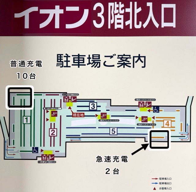 立体駐車場の4階にあります。南東にある入り口から入るとスロープを登ってすぐ右側ですが、一方通行だと思いますので左から回っていくと良いかと思います。 北側のスロープから入ると「矢印に従って」大きく時計回りになるように進んでいくとあります。白枠が急速で青枠が普通充電です。 姫路にあるイオンモールは最近故障も増えてきて、3店舗全てが故障中の時もあったみたいですが、西の「姫路大津店」が更新時に増設され、エネオスチャージプラスの2台になっています。リバーシティー店もいずれはと期待はしてしまいます。 どちらのイオンモールも屋内の充電器なので雨でも問題ありません。大型ショッピングモールにおいて非常に有益な充電スポットです。 北のイオンタウンは屋外ですが200Vコンセントが無料のままです。大阪の「イオンタウン」にあるエネオスチャージはWAONでもエネオスの通常価格になっています。どうなるでしょうか。 最後に、このスポットの位置は(2)の普通充電の少し北側です。修正できればお願いします。