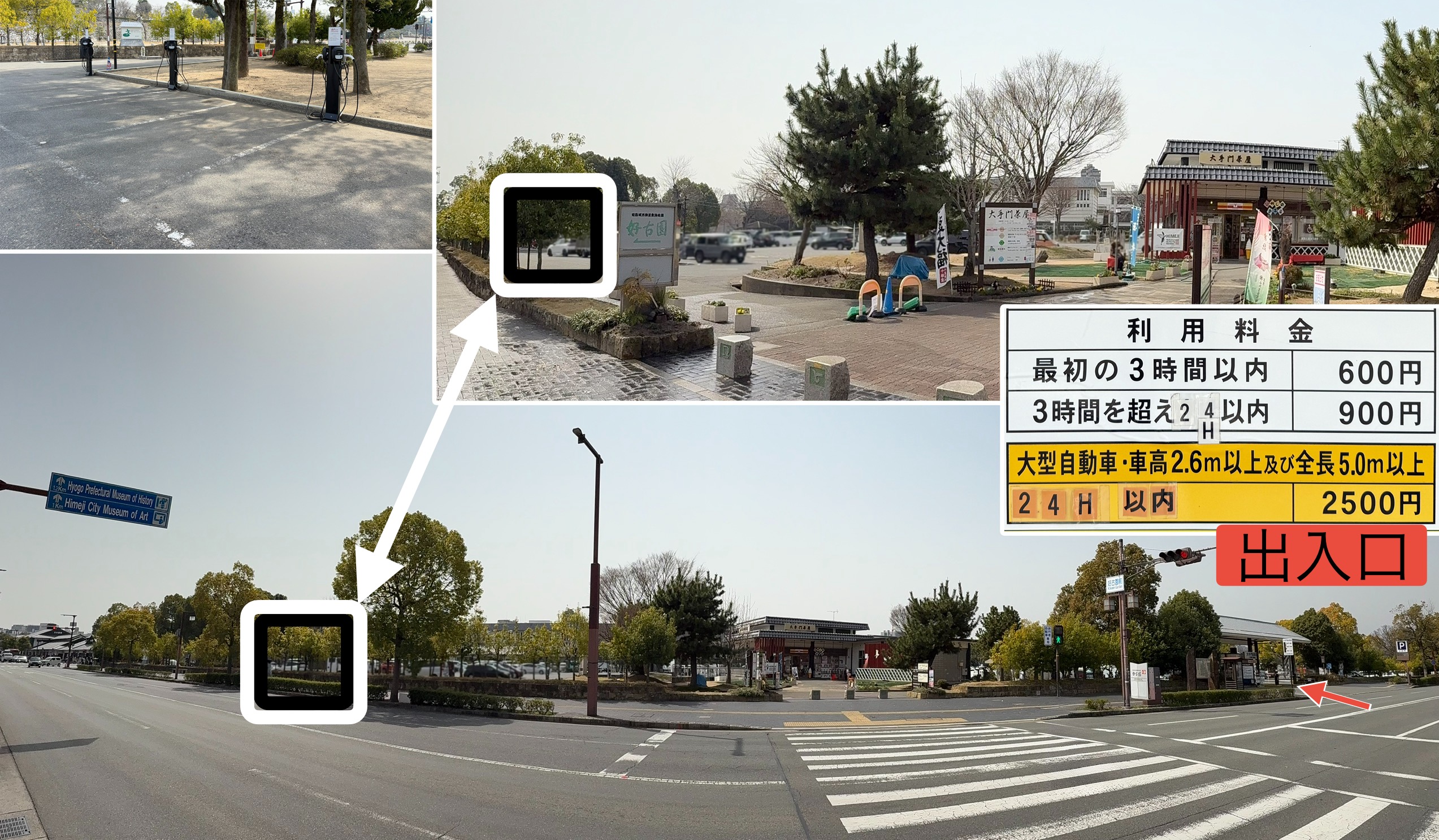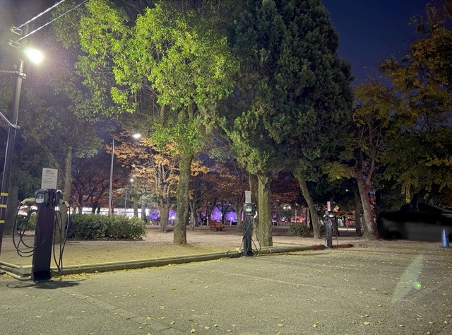 道路から見て左側(東)の道路寄りにあります。文書と写真追加 立派な入り口から入って奥まで進んで左折します。その向きから左奥の道路に近い車室にあります。 この時も紅葉のライトアップでこんざつしていましたが、見事に空いていました。快適でかつ6kWの充電、とても良いところに設置していただきました。他の観光名所もぜひ、かざすだけで使えるエネチェンジでお願いしたいところです。