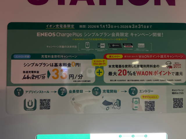 [急速充電器] 2025/05/15よりeMPスポットとして運用。 【ビジター料金やeMP未加盟充電器の情報等】 [急速充電器] 認証システム:ENEOS Charge Plus ◆ENEOS Charge Plus認証の場合 ENEOS Charge Plus:1分/46.2円 (会員) ENEOS Charge Plus:1分/49.5円 (非会員) EneKey、WAON、nanaco、クレジットカード支払いも可能。 ◆WAON認証の場合 WAON(充電1回30分300円(税込))。