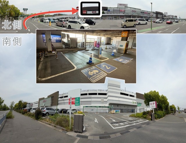 • 立体駐車場2階の西側の店舗入り口とは離れた方の中央寄りに並んでいます。 コントローラーは「店内連絡口 A」の方にあります。 コントローラーがフードコートに行くには遠い方なので、コントローラーの位置は充電器に近いところがやはり良いですね。