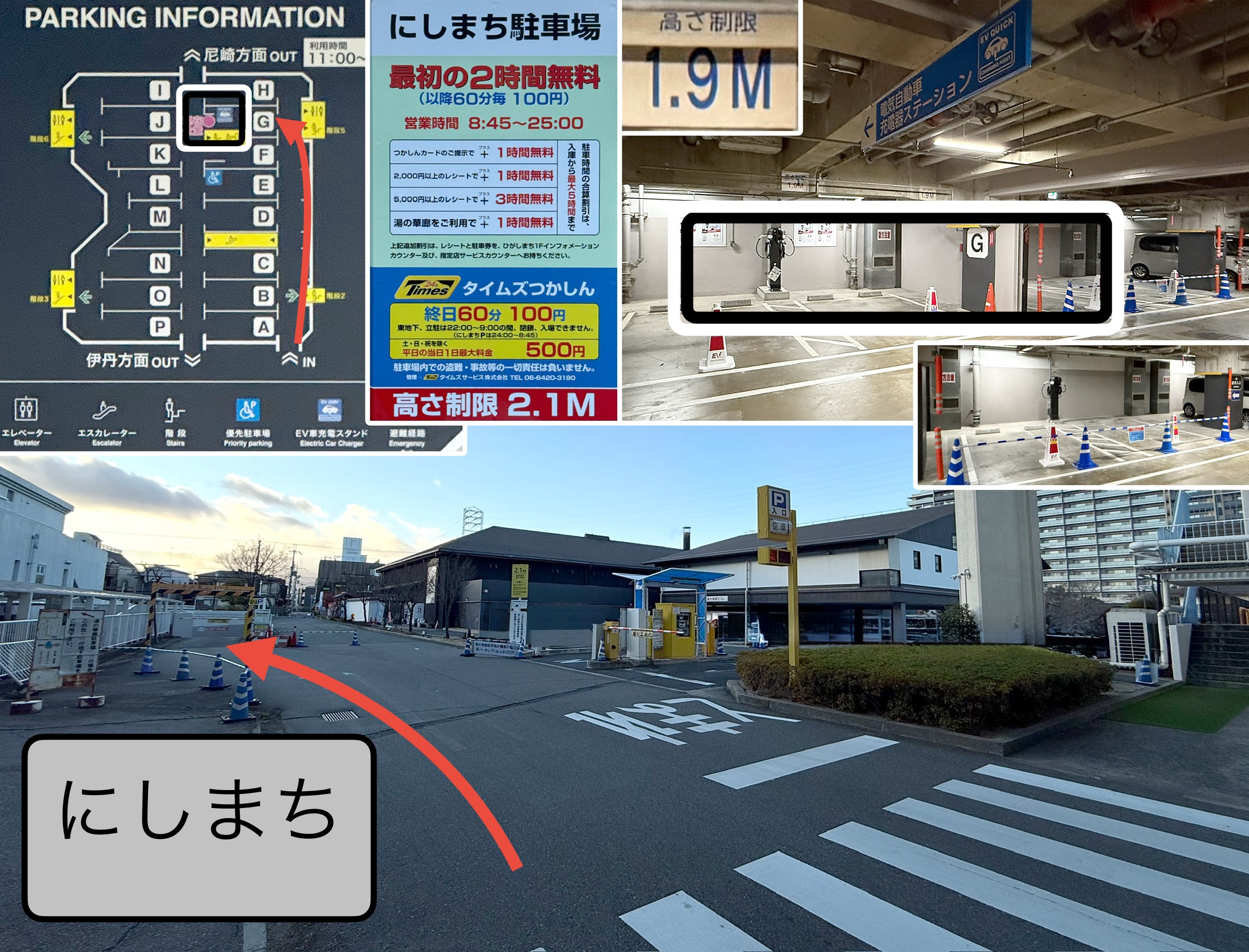 「にしまち駐車場」側のコメントです。 敷地に入って、「にしまち」や「温浴」の方向を目指して進むとここに来ます。左側の地下に入ると「G」の列に入ると右側に4台のエネチェンジがあります。 充電器番号は左から若い順になっています。 G列に入るところにトイレもあり、上がれば食事するところも近く買い物なくとも便利だと思います。文書改訂2 文書削除12.29