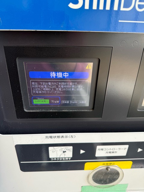CHAdeMO充電設備が日産製から最大125A放電する東光高岳(高岳製作所)製へ更新されています。 既に稼働を始めているとのことで下見に行きました。 液晶画面にて50kW放電可能と表示されていました。