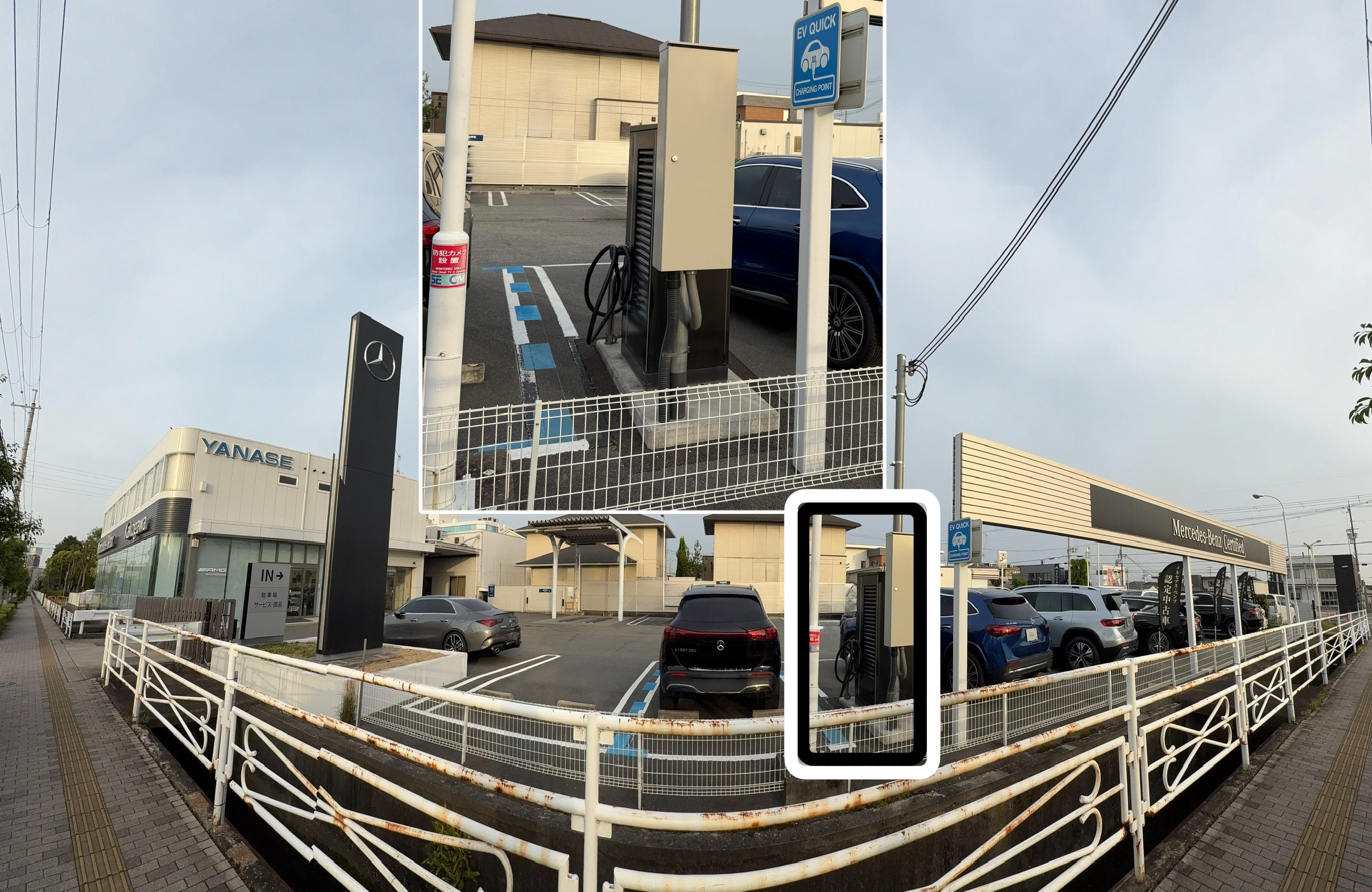 EV用CHAdeMO充電設備は、敷地西側の道路から敷地に入って右Uターンした位置に設置されています。 水路そばに設置されている「青いEV QUICKのマーク」を目印にするのも良いかもしれません。