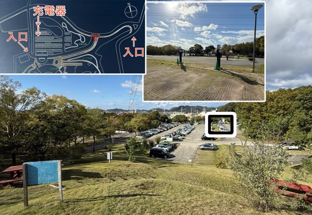 東の大きい道から敷地に入って奥に進み奥で右にいくとあります。 西の細い道から入ると最初に左折しすぐ右前方に見えています。 ここは充電器の両面に車室があるので表も裏も充電できるのでいい感じですね。 現状で問題はないと思いますが、混雑時は結構混んでいますので、コーンはバランスよくお願いします。 文書改訂2と写真改訂