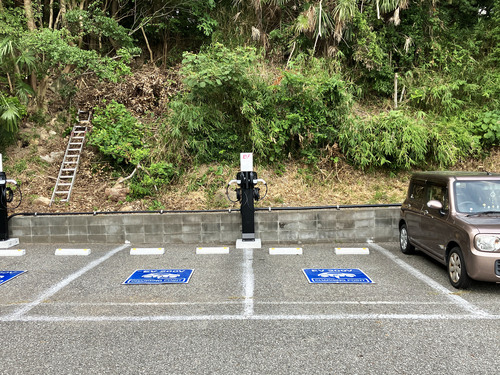 坂を登って建物の下を通り抜けたら左側にあります。 加工で消していますがガソリン車がよく止まっていますので、コーンなどの対策は必要だと思います。 コーン自体はありますが、退けて駐車したのか、写真の通りの位置にあって、充電車室の確保にはなってなかったかは分かりません。 稼働率アップを期待しております。
