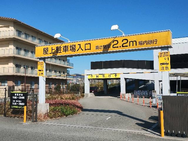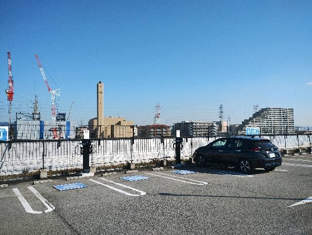 EV用普通充電設備は、屋上駐車場東側(武庫川より)に設置されています。 屋上駐車場は高さ制限2.2mなのでルーフボックスなどを取り付けているSUVタイプ等は注意が必要です。 駐車場自体は6:30から入場可能だそうですが、屋上駐車場から店内に入る入口が朝9時にならないと利用出来ないのでご注意ください。 充電設備設置に加えて今年度中にeハイゼットカーゴの販売開始と言うビジネスチャンスを逃さないために運用面の改善を店長さんへ要望しました。 エンジン車駐車防止対策として、「青いEV200Vマーク」が4台分充電用駐車スペース中央付近に設置されています。 敷地内にスーパー万代、PISOLA(食べ放題メインのイタリアン)、歯科も有るので、特にPISOLAで食べ放題ランチの「ついでに充電」が良さげかな?