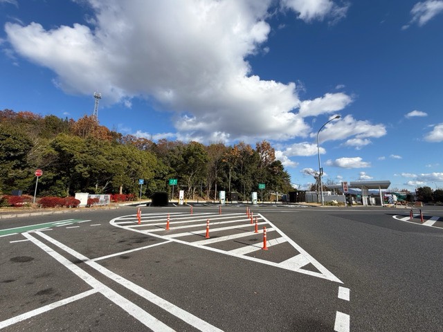 施設建物を超えていくとガソリンスタンドの手前にあります。 あまり充電に詳しくないような方は、おそらく手前から入って充電していくと思いますので、高速な充電器は遠くにおいたほうが良いかなとか思ったりもします。 90kW以上しかないことで、50kW以下の充電能力のEVの方にはかなり勿体無いことに、充電器の出力で値段を変えるのではなく、充電中に50kW以上の出力が出なかった場合は、50kW以下の価格になるなどの仕組みが欲しいですね。 エネチェンジの普通充電器はeKクロスEVや日産サクラなど特にユーザーが何かしなくとも3kWの値段になります。うろ覚えではありますが、たしか充電中の出力が平均?4kW以下になると金額が3kWの値段になるというのを見たことがあります。そのような工夫が急速充電にも欲しいと思われます。