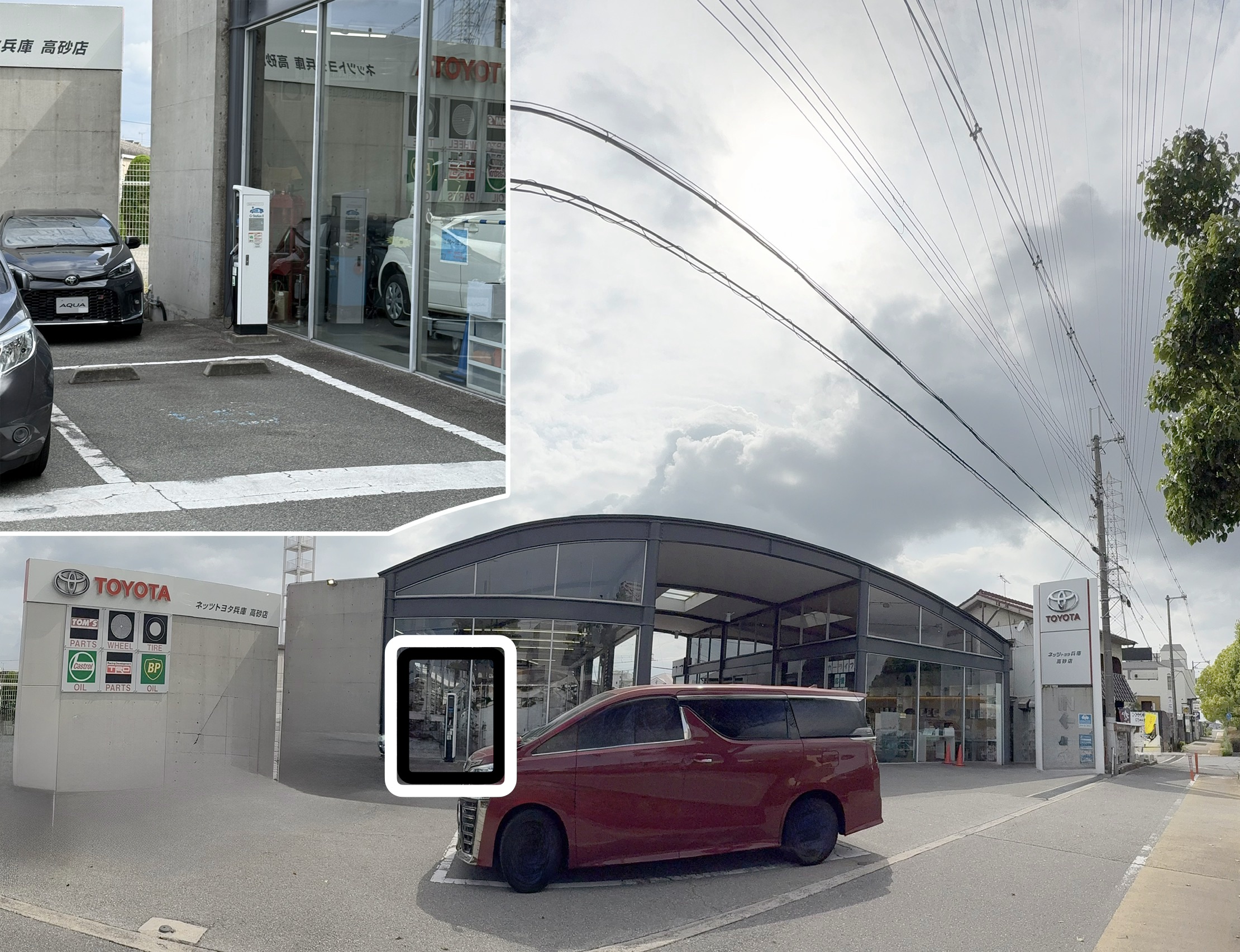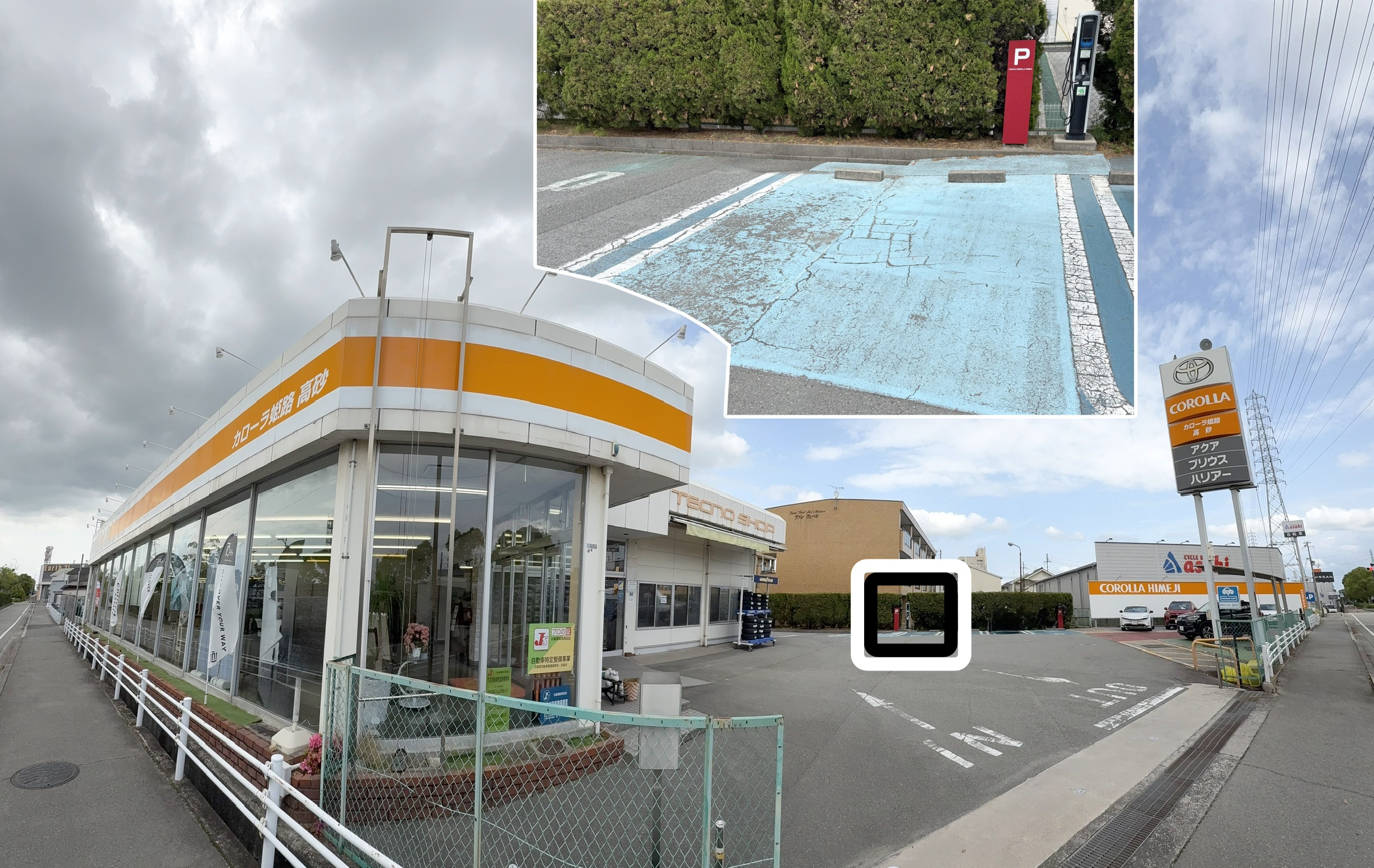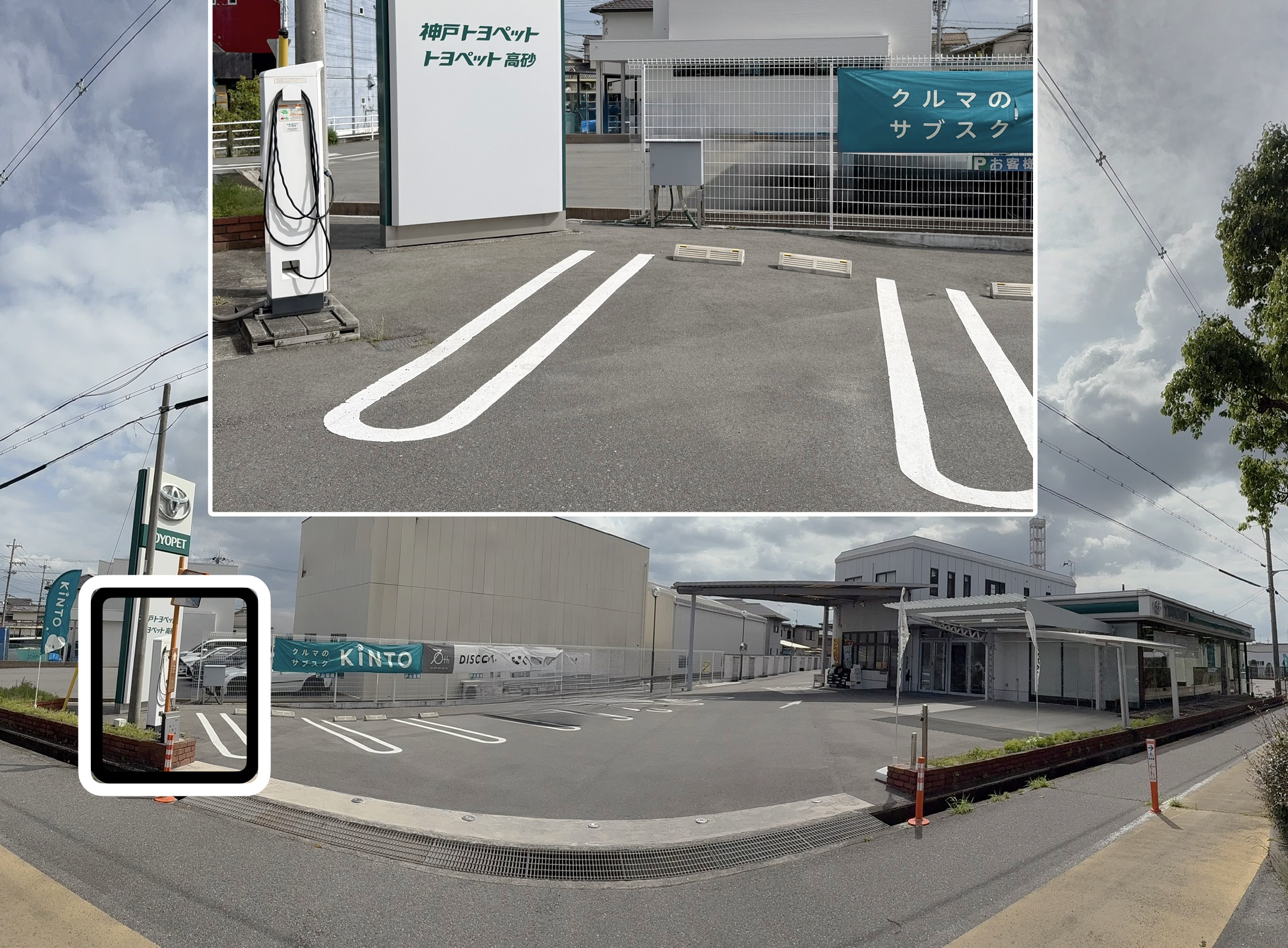 EV用CHAdeMO充電設備は、敷地東側の駐車スペースに設置されています。 設備としては最大200A放電できる2台同時充電可能なのですが、地域の主要道路のR2姫路バイパス別所ランプから約2.6kmと微妙に離れているのが少し難点。 姫路バイパスから離れていることで充電設備の利用が抑えられ、充電待ちに遭いにくいことがある意味でメリットになる可能性は有りますが・・・。