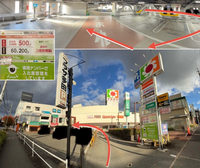 イズミヤとプラザ多田の看板の間から敷地に入って、立体駐車場の2階に入って、ぐるっと回って出口近くにあります。