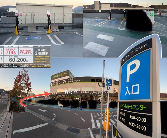 店舗左側のスロープから上がると、最初の「とまれ」のあたり、屋上駐車場の東側、阪急オアシスとつながる橋の左側にあります。 阪急オアシス側から来ると、橋を渡ってすぐ右なのですが、逆走になるので矢印に従って一周回ってくる感じになります。 ここは2台ずつに分かれてそれぞれ、計6つちょいの車室が使えそうです。 充電器番号は左から「?」「232687」「232689」「?」となっています。後ほど分かれば記入します、覚えていれば、、