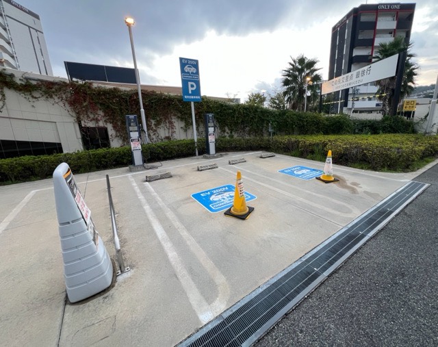 オアシスタウン平面(地上)駐車場、入ってすぐ右、立駐へ上がるスロープの下(パイロンあり)にあります。 初回のみ、阪急オアシスのカウンター(外から見てレジ右側のギフトコーナー)で、3桁の暗証番号を聞く必要があります。次回からは同じ番号です(公開はされていませんので、ここに書かないようにしてください)。 充電機はケーブル付属のパナソニック製、ICカードリーダーはありますが、暗証番号だけでカードは必要ありません。このためNCSには対応せず、アプリで満空情報は見えません。先に暗証番号を入れてから充電時間を選び、その後車にケーブルを挿すと充電開始。駐車場は無料で、広く停めやすいです。