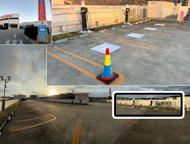 屋上駐車場の、北側のスロープの近くの列にあります。 写真追加 コーンが両端にふたつ置いてある感じでした。 駐車の時に手間もなく止めれるのと、ここからここまでのエリアみたいな感じの置き方も良いと感じました。 さらには充電車室が端からではなく、右側に1車室分を空けて設置されています。これは万が一の時でも充電できる可能性が少しでも上がるのでとても良いかなと思います。 非充電車の問題だけではなく、もし4台とも充電している場合、充電車両の隣の車室は待機場所にもでき、充電口の位置によりますが車を移動しなくても繋ぎ直すだけで充電できる可能性もあります。 他の充電スポットでも、期待したいと思います。