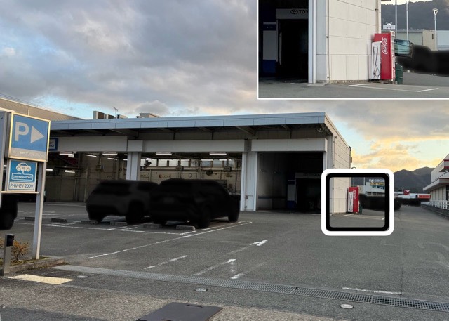 EV用CHAdeMO充電設備は、敷地北側の駐車スペース西寄り(青い駐車スペース左端から更に左)に設置されています。 充電設備は、最大125A流れるニチコン製です。 液晶画面には「出力可能電力50kW」と表示されていました。 私のアイ・ミーブXで充電を行ったところ、設備最大の125Aで充電が始まりました。 eエブリイ発売前にCHAdeMO充電設備の運用を始めたことは評価できますが、店舗営業中しか利用出来ないのは大きなマイナス。 実際のユーザーニーズや近隣の日産店舗が24時間運用していることを考慮しなかったのが大きな疑問。 別の言い方をすると、三菱や日産と比べて10年以上後出しジャンケンであることのメリットを活かせていません。 電力会社からの引き込み線は店舗入口(EV QUICKの表示板そば)なので、その横に充電設備を設置し、バリカーをその周囲に設置すれば24時間運用が可能なのに。