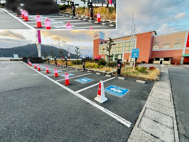 全てにコーンがあるので安心ですね。 個人的にはここの安心感というのはは200%の安心度と感じます。 本当は100%といいたいところですが、99%ぐらいの安心感で十分だと思っています。 100%〜200%までの安心感は、EVユーザーの手間になって帰ってきています。写真にも写ってますが、コーンを戻してない方がいます。手間だと感じている証拠です。 もちろん他のいろんな思考もあると思っていますが、長くなるので端折ります。 古くから乗っているEVユーザーほどコーンなどが必要だと感じていると思います。 今時からEVに乗り始めるユーザーが、どれほどコーンを必要として、移動してまで充電しようとするのか、そんな手間がかかるものが普及していくのかなどと思います。 他の急速や他の施設なら、それぞれで必要数のコーンなどの対策があれば良いと思っています。 100%以上の安心、必要でしょうか。 ちなみに私はあのコーンのないところを利用して充電中にちょっとした買い物してきました。もちろんコーンは戻しました。 この施設の方にコーンを戻す手間をかけないようにです。