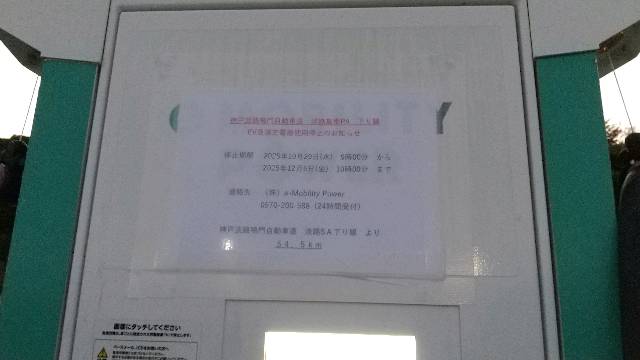 淡路SAから、淡路南PAまで距離が長く走行可能距離10キロ以下で滑り込み……間のPAに充電設備が欲しいです!