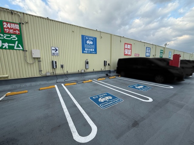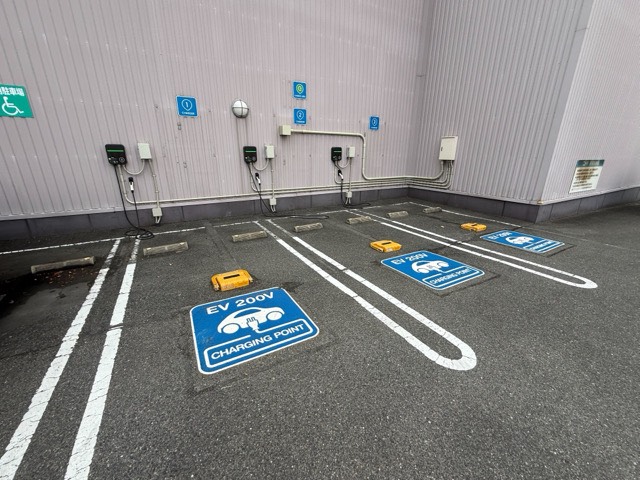 設置場所:施設入口を正面に見て左側の駐車スペースの一番奥の車室にEV充電器があります。 どなたでもご利用いただけます。 最大出力6kW