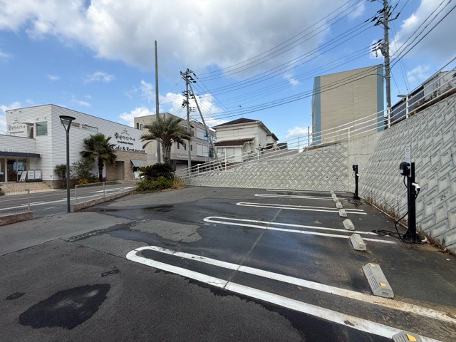 お店より少し南側の「第6駐車場」にあります。入って左に進むと奥にあります。 予約者専用の店舗が目の前にありました。 充電器も配置としては、端から置かずに1枠開けていて、充電器2台に対し車室は4か5つ分に対応しています。まだオープンまで10数分ありましたので端から5つ目の車室で充電したところ届きました(5つ目はEVの充電口によっては届かないのもあると思います) このような「1つの充電器で複数の車室」に対応していると、使える確率がアップするので充電車室確保のためのコーンなども必要最低限で良いかと思います。施設が空いている時間だとコーンを退けなくてもケーブルが届く車室でさっと充電できるのでユーザー側も楽だと思います。 写真にはガソリン車が止まっていますが、これはお店の車で、営業時間になると移動する感じです。おしゃれな車もありましたので、ナンバーと車内だけ編集しました。